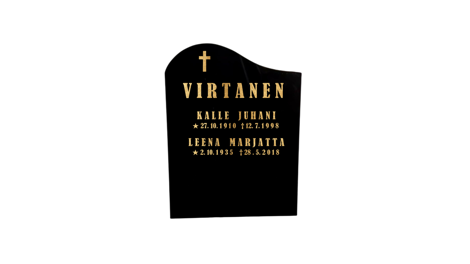 Musta graniitti on perinteinen hyvin tasavärinen kivilaatu. Kullattu tai hopeoitu kaiverrus antaa arvokkaan silauksen mustaan kiveen. Myös harmaa tai valkoinen teksti sopii ja erottuu hyvin.